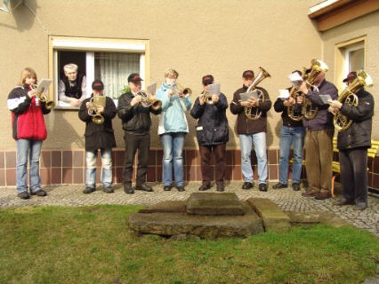 Jedes Jahr legen die Osterbläser eine Strecke von ca. 10 km zurück und bewegen sich somit fast 2 mal durch das gesamte Dorf. Ein gutes Frühstück bildet gegen 3.00 Uhr im Depot der FFW-Berthelsdorf eine gute Grundlage für diesen Marsch und natürlich werden an einigen Stellen im Dorf durch zahlreiche Einwohner und Freunde des Osterblasens weiter kleine Stärkungen und warme Getränke gereicht. All Jenen sei an dieser Stelle von ganzem Herzen gedankt.Um 3.45 Uhr beginnt das Osterblasen auf der Freitreppe des Haus Friedenshoffnung mit dem ersten Lied. Diesem werden im Verlauf des Morgen´s weiter fast 100 Ständchen folgen. Gegen 7.00 Uhr wird in der "Eiche", dem ehemaligen Stammlokal der FFW, das zweite Frühstück durch Frau Schuster gereicht, welches nach über 3 Stunden Fußmarsch gern angenommen wird. Gegen 11.00 Uhr findet das Osterblasen wie jedes Jahr seinen Abschluß mit dem letzten Lied im Mitteldorf am ehem. Wohnhaus der Fam. Thamm , in der Nähe des "Broilerstübels. |